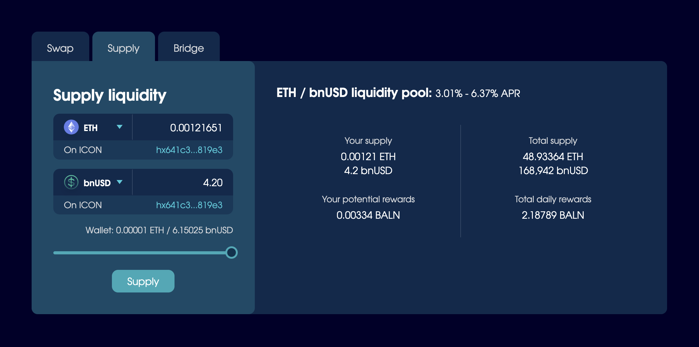 If you add BNB or ETH to an ICON wallet, you can also borrow bnUSD and supply liquidity.