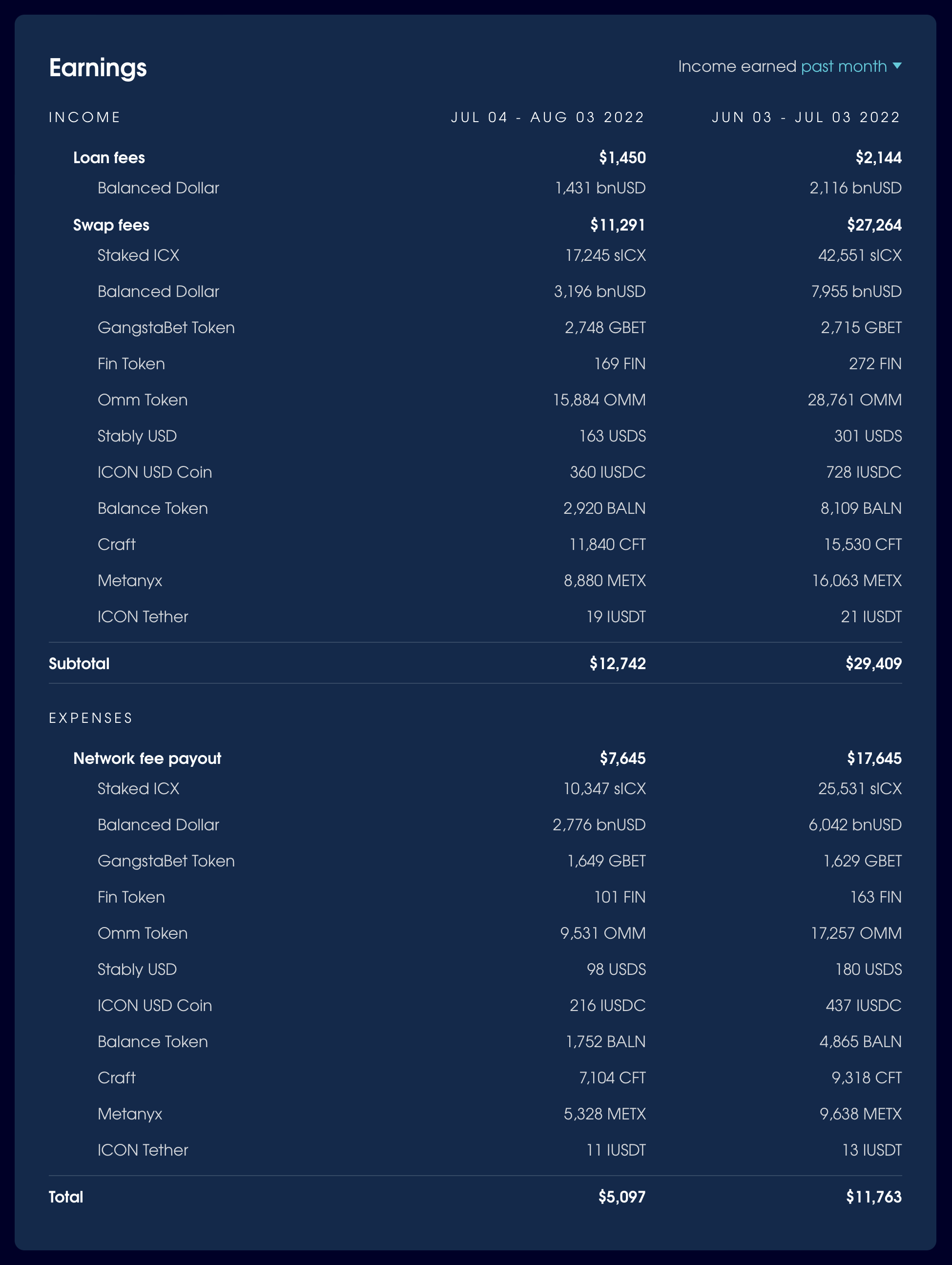 In the month from 4 July - 3 August, Balanced earned 1,431 bnUSD from loan fees and $11,291 from swap fees, for a combined value of $12,742.