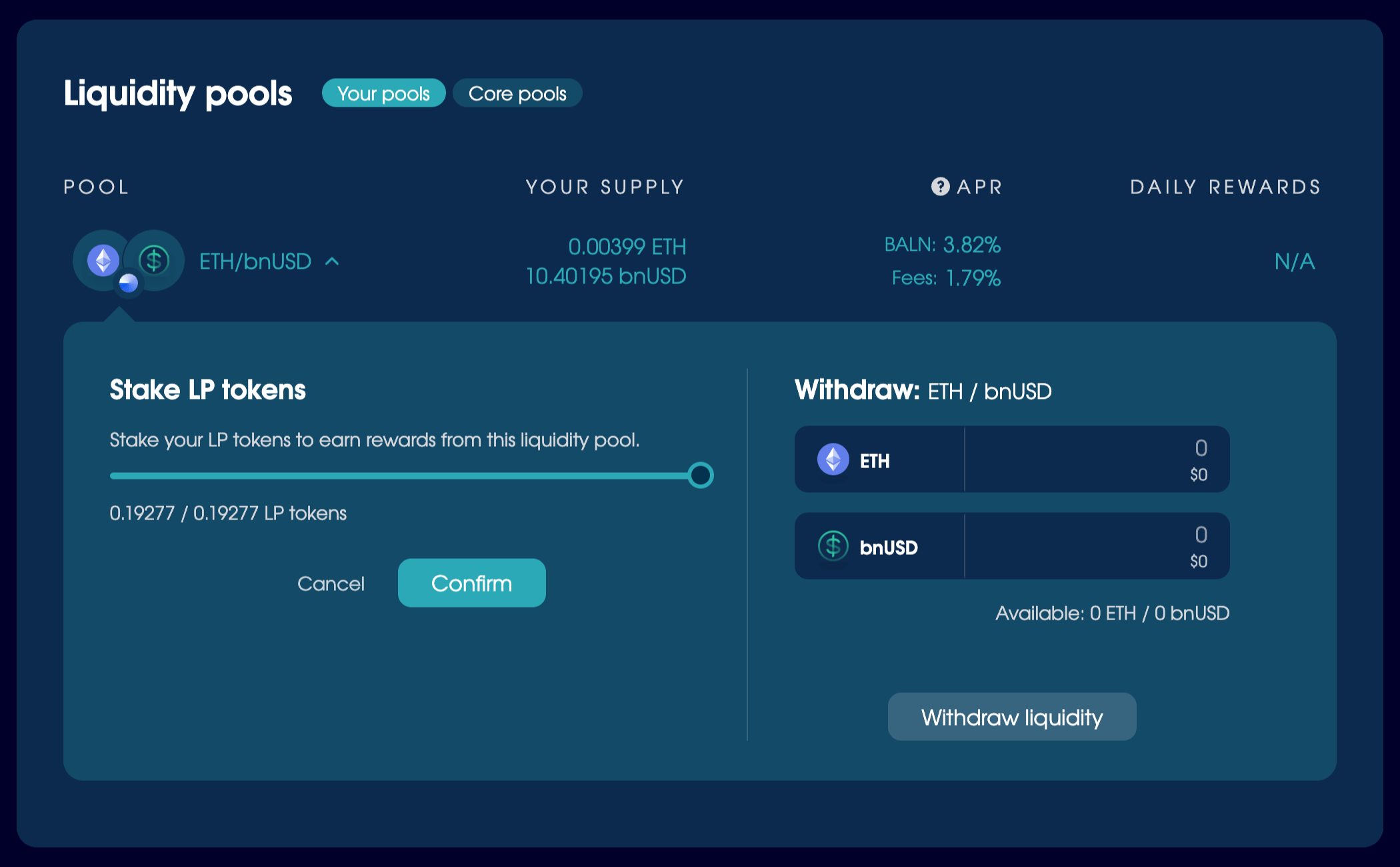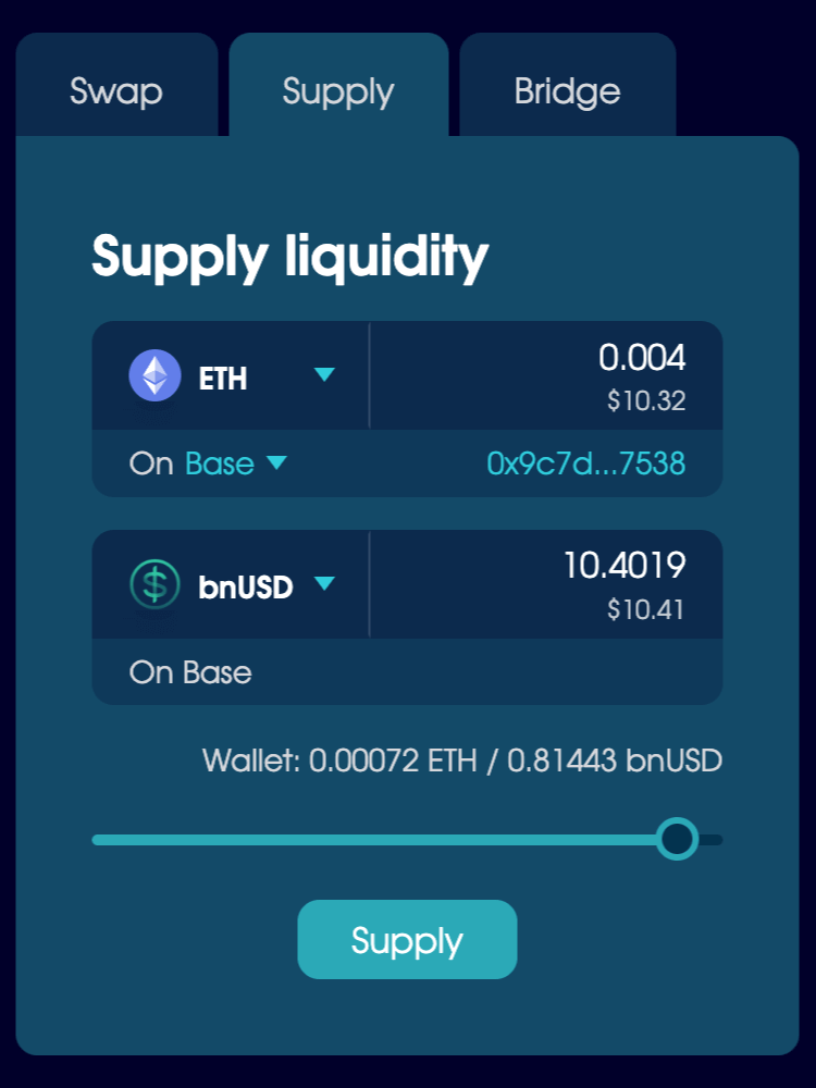 - Set the amount, then click Supply and follow the prompts to send your assets to the pool.