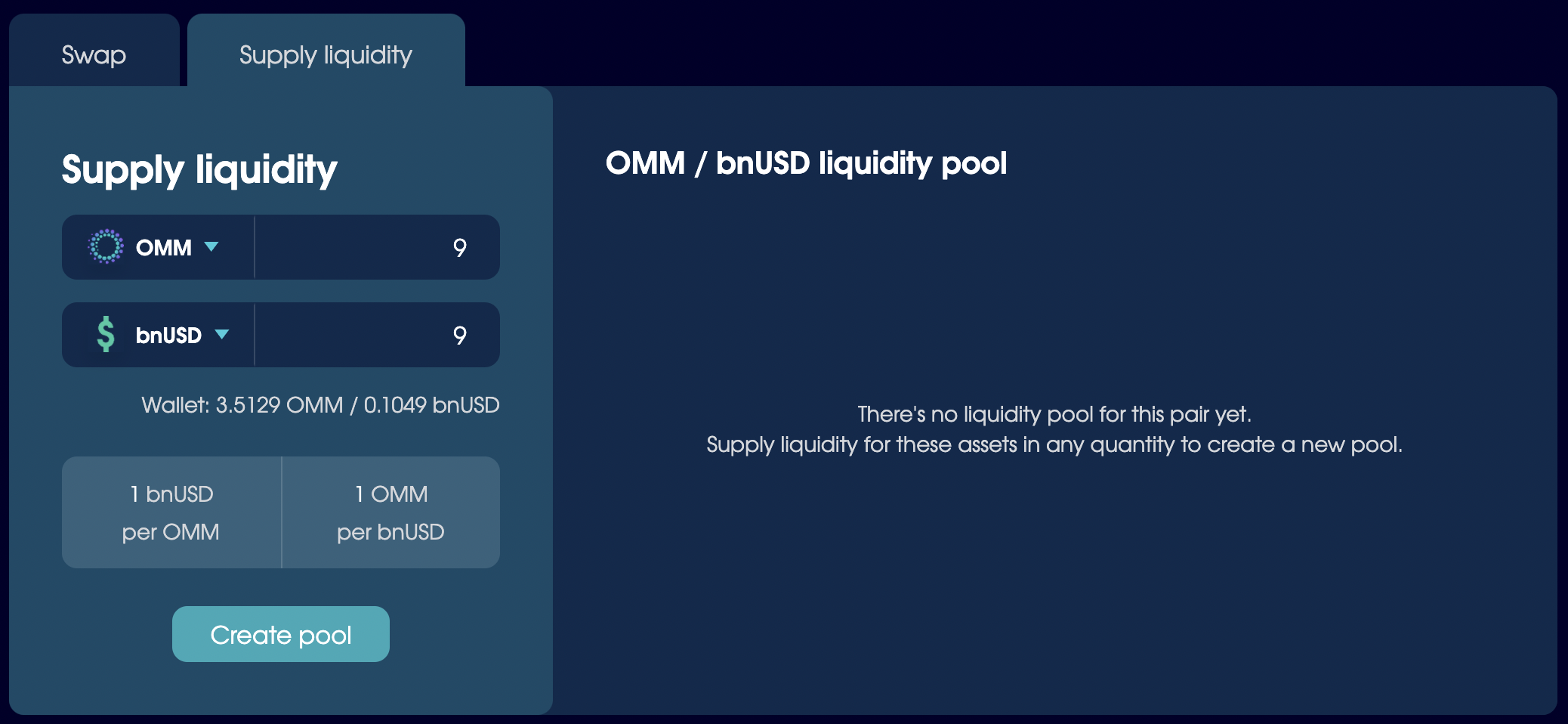 To create a new liquidity pool, go to the 'Supply liquidity' section, click the first asset dropdown and choose an asset – either your new custom token, or an existing asset. Pair it against sICX, bnUSD, IUSDC, or USDS, then enter the amount to supply for each asset to set the initial price ratio. Click 'Create pool' and supply your liquidity.