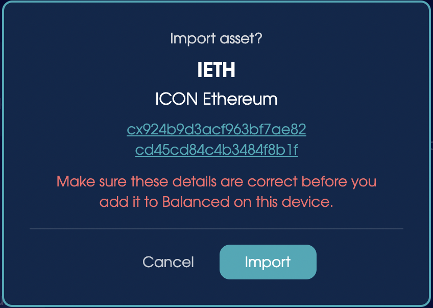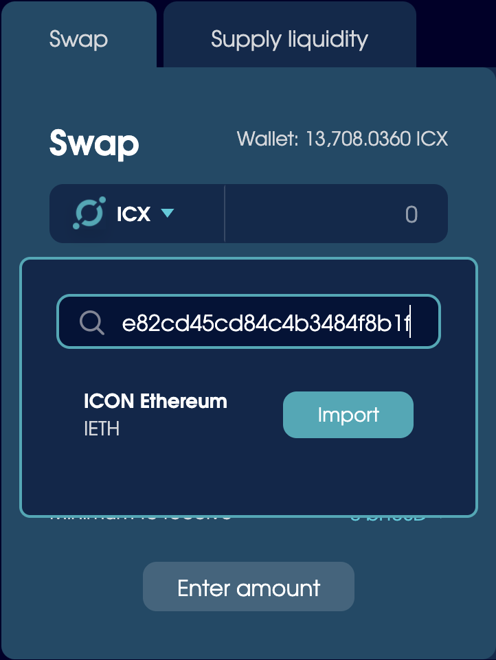 To import a custom token, click the Swap or Supply asset dropdown, then paste the token's contract address into the search field. Click Import when it finds a match, check the details are correct, then import it. You'll then be able to interact with this asset in Balanced using any wallet on your device. It won't be added to Balanced on any other device – if you want Balanced to officially support it, talk to the Balanced developers on Discord.