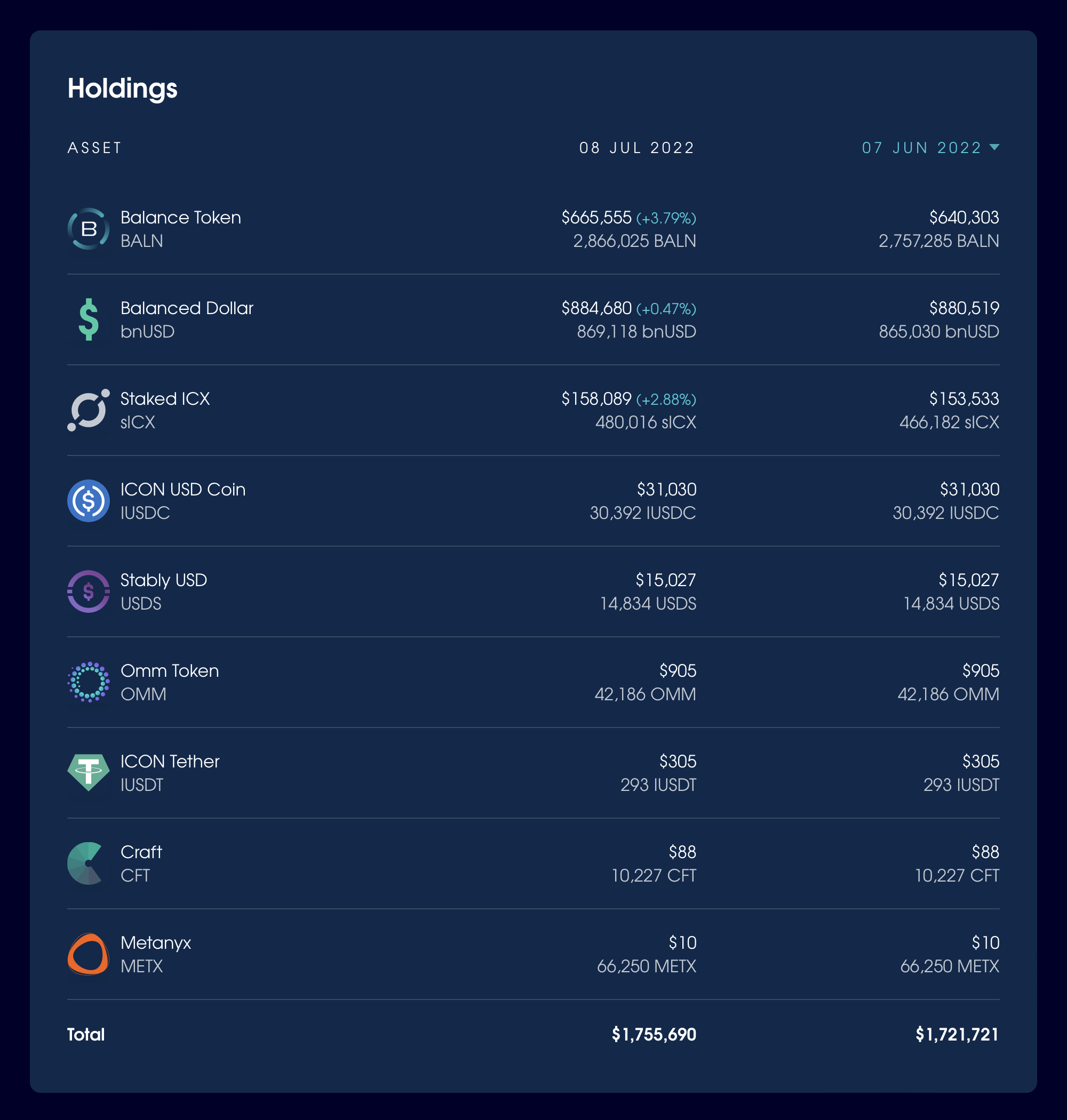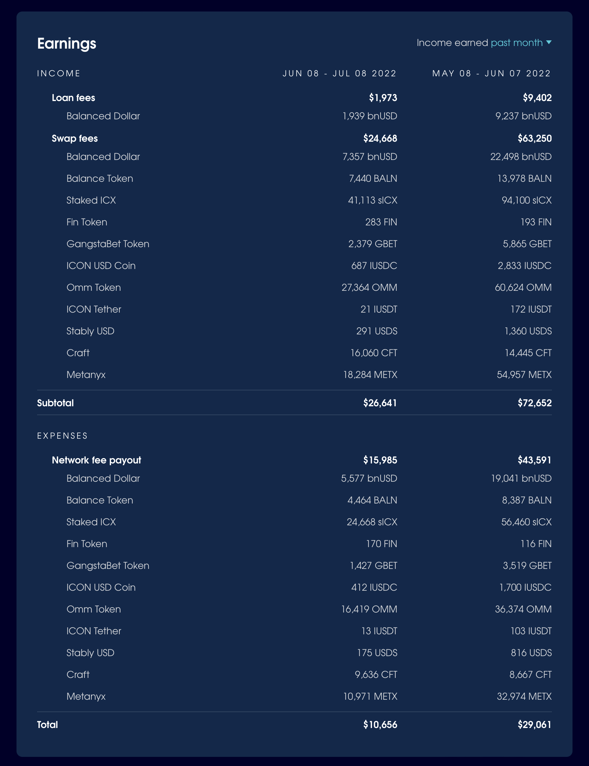 In the month from 8 June - 8 July, Balanced earned 1,973 bnUSD from loan fees and $24,668 from swap fees, for a total value of $26,641 – 63.3% less than the previous month. While this is a significant decline, it was expected given the state of the markets recently.