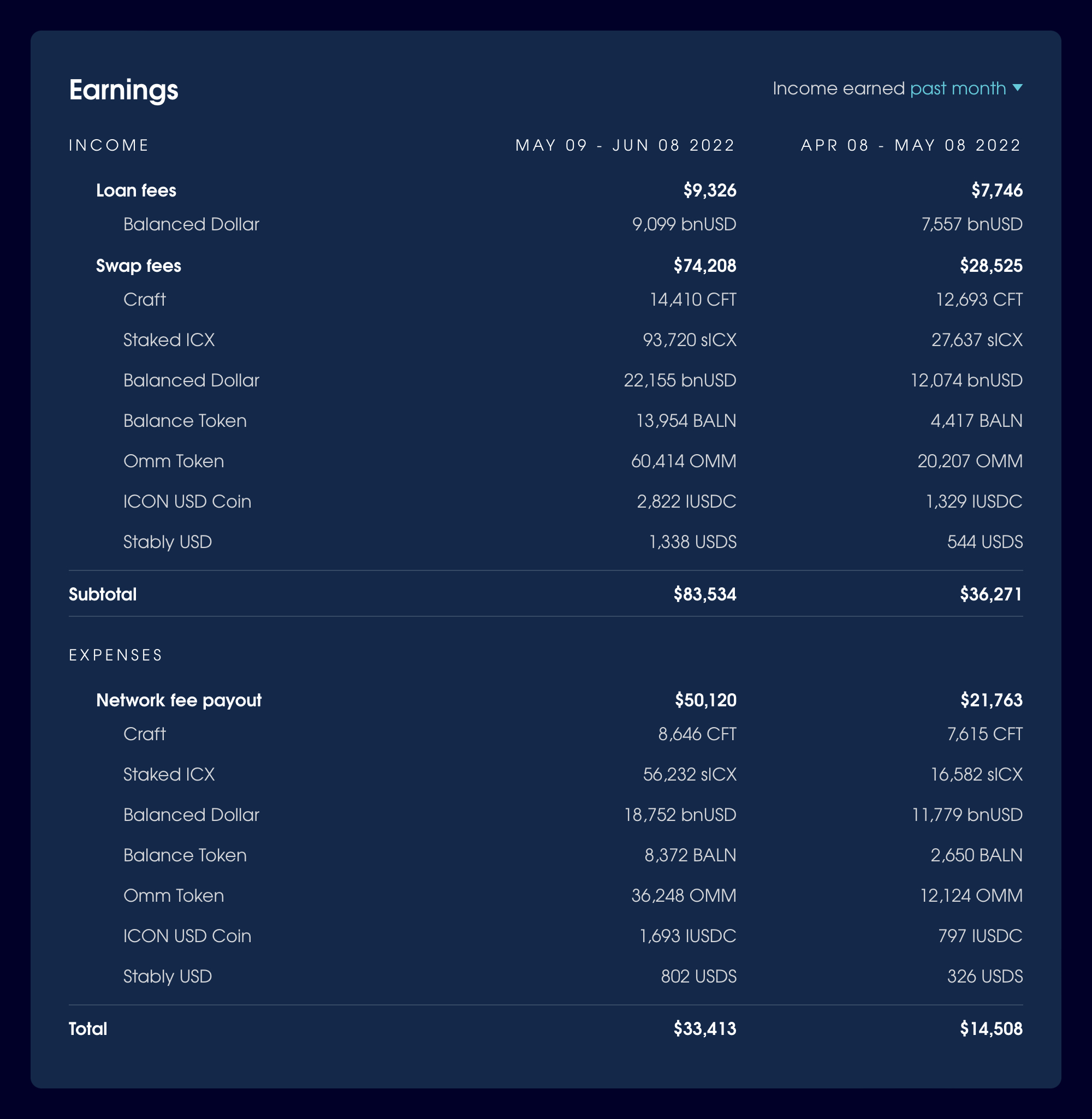 In the month from 9 May - 8 June, Balanced earned 9,099 bnUSD from loan fees and $74,208 from swap fees, for a total of $83,534 โ a 130.3% increase from the previous month.