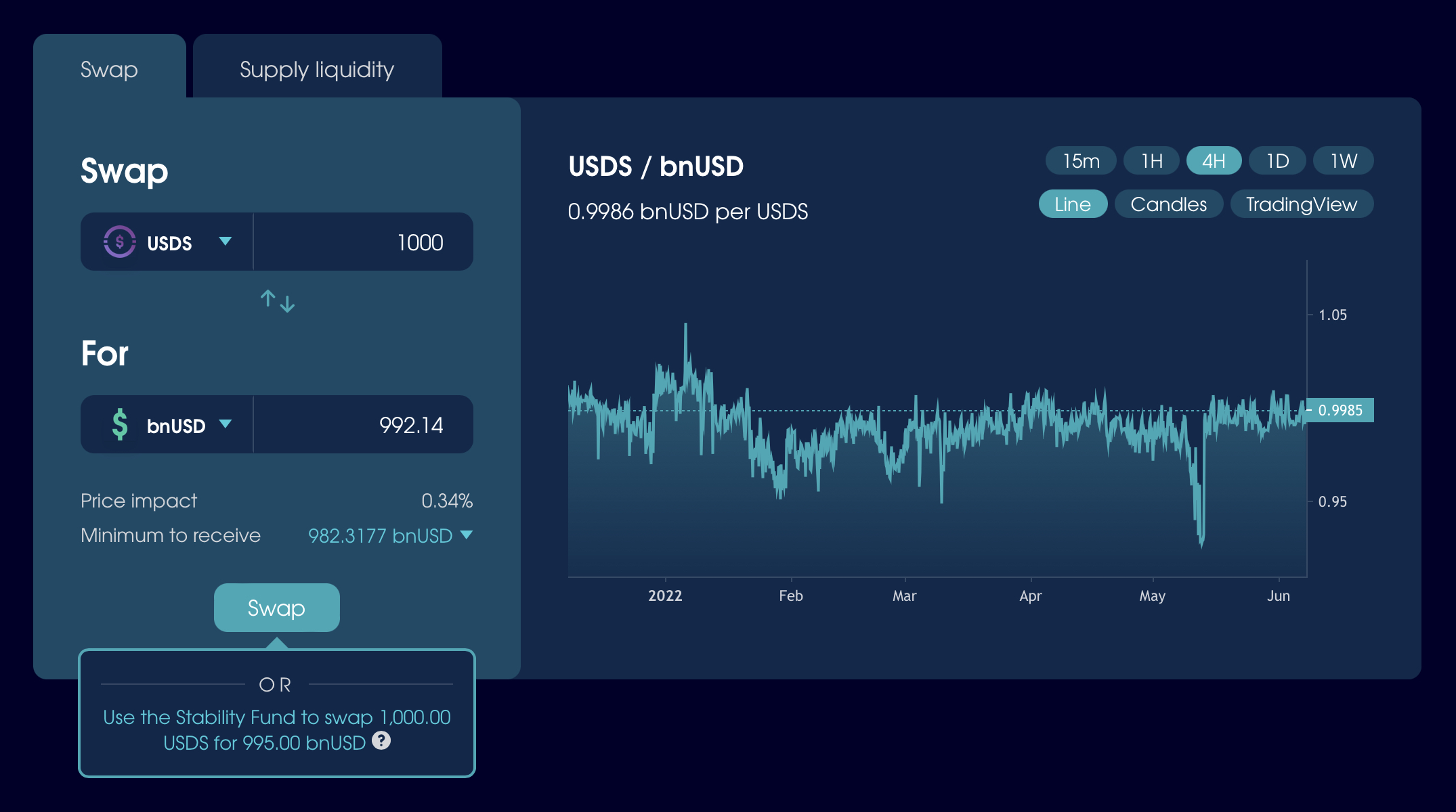 - Send bnUSD to the Stability Fund to burn it, and receive an equivalent amount of IUSDC or USDS (minus a 0.5% fee).