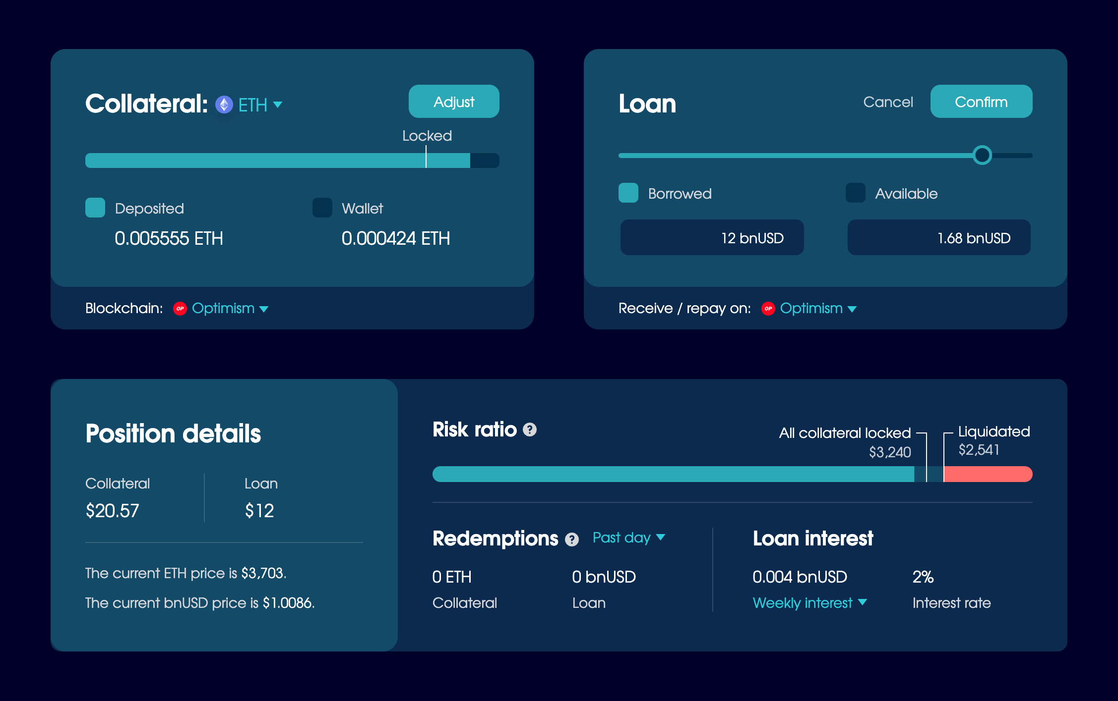 bnUSD is a decentralised, over-collateralised, cross-chain stablecoin, and you can leverage ETH on Optimism to get some. Borrow up to 67% of the value in bnUSD, and pay a 0.2% fee and 2% interest.