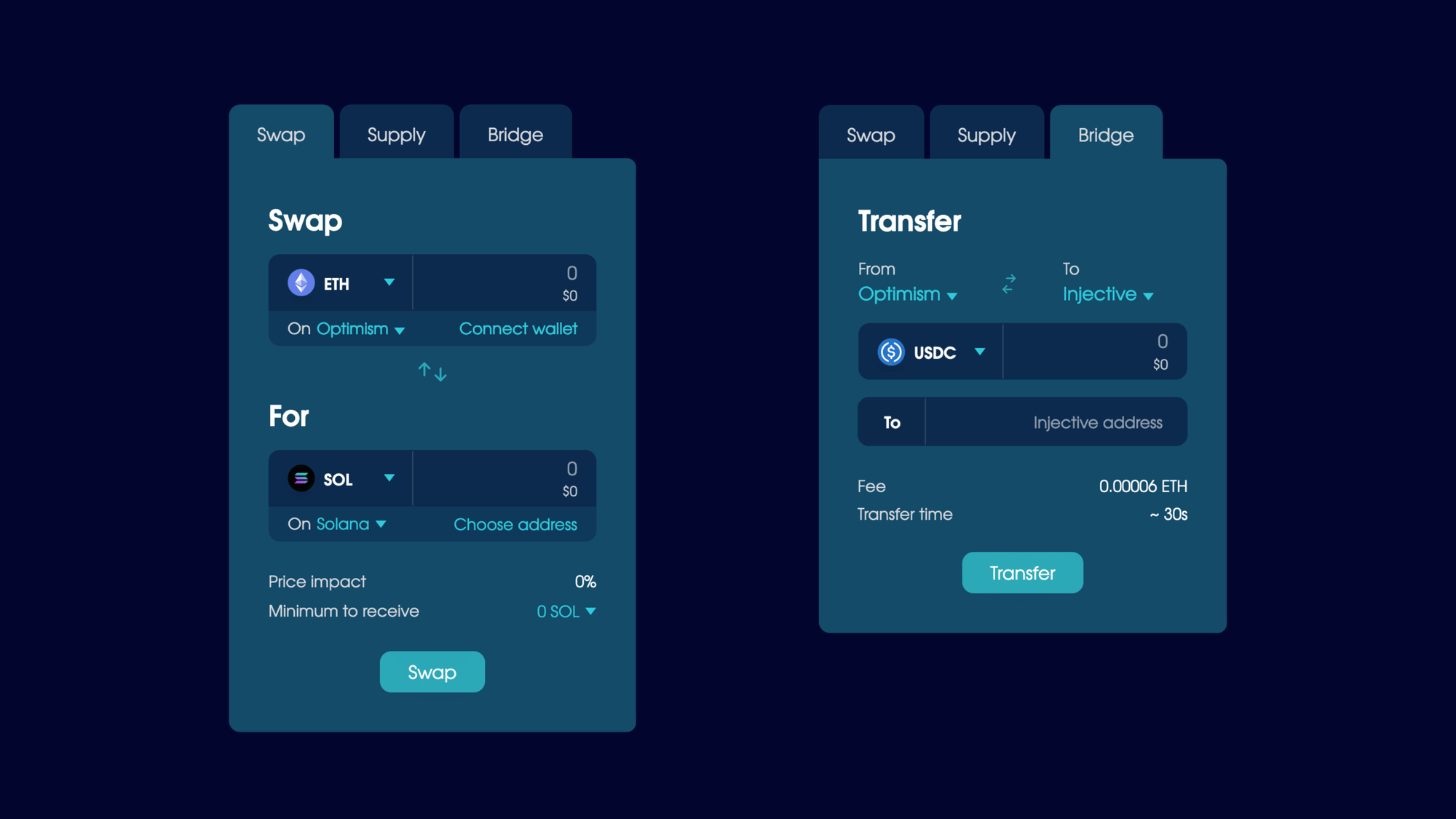 Balanced supports ETH, USDC, bnUSD, and BALN (the Balanced governance token) wrapper-free on Optimism. Swap them for crypto on other blockchains, or transfer them to a connected chain.