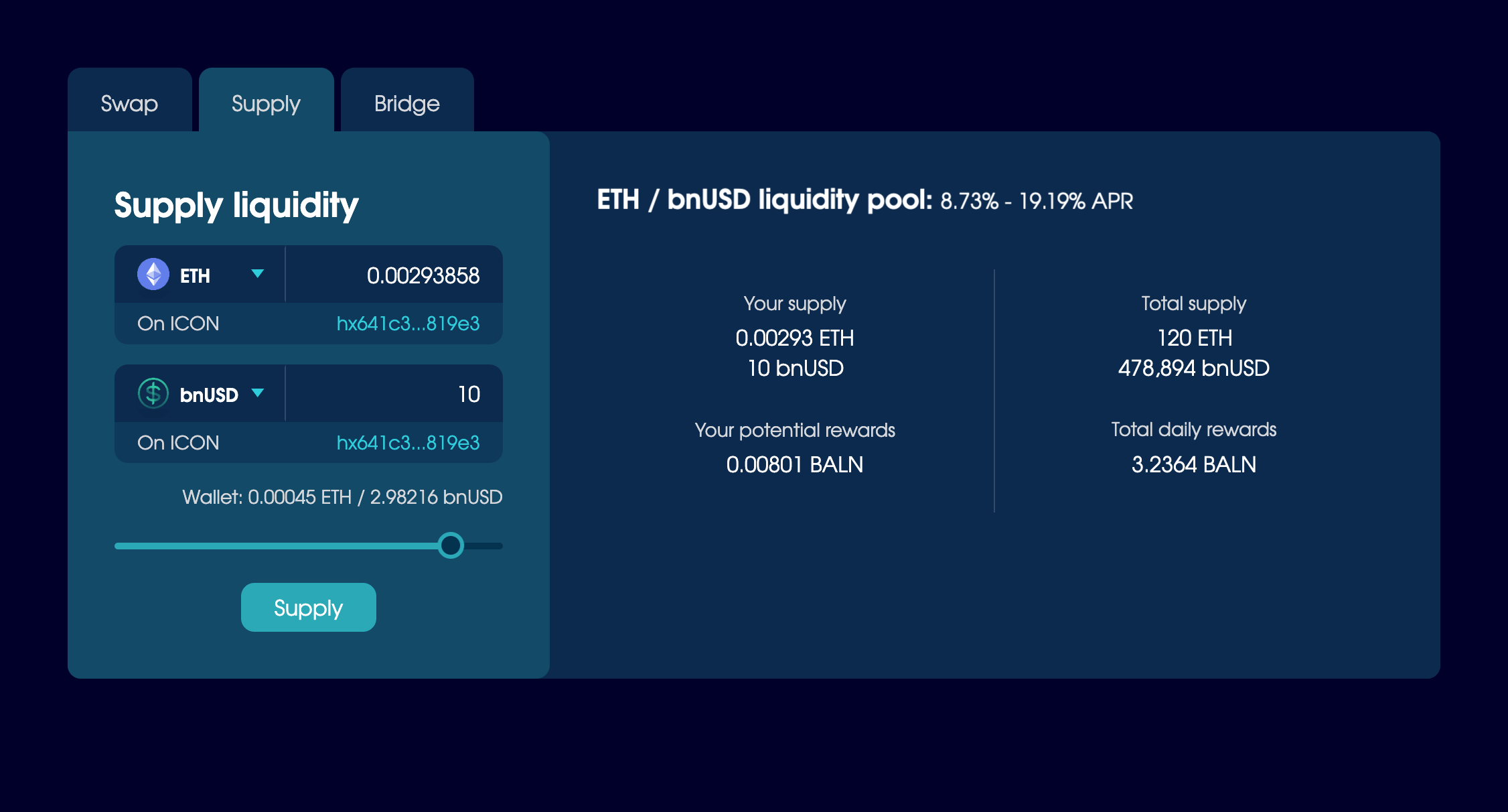 If you connect an ICON wallet and add ETH and bnUSD to it, you can also supply liquidity to improve the trading experience. Liquidity pools earn 50% of the fee from each trade, and once cross-chain pools launch in January 2025, you can provide liquidity directly from Optimism.