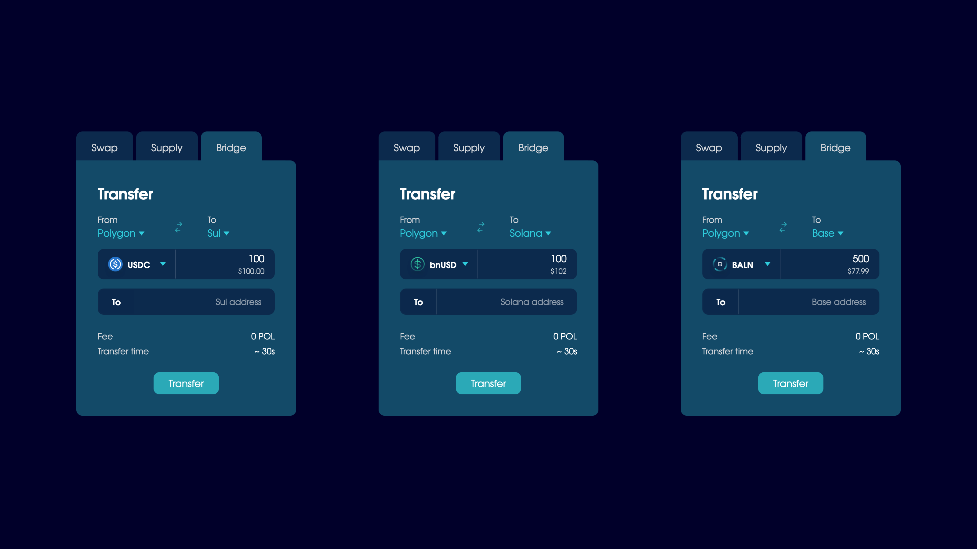 Use Balanced to simplify your cross-chain DeFi experience. It’s available on Arbitrum, Archway, Avalanche, Base, BNB Chain, Havah, ICON, Injective, Optimism, Solana, Stellar, Sui, and now Polygon.