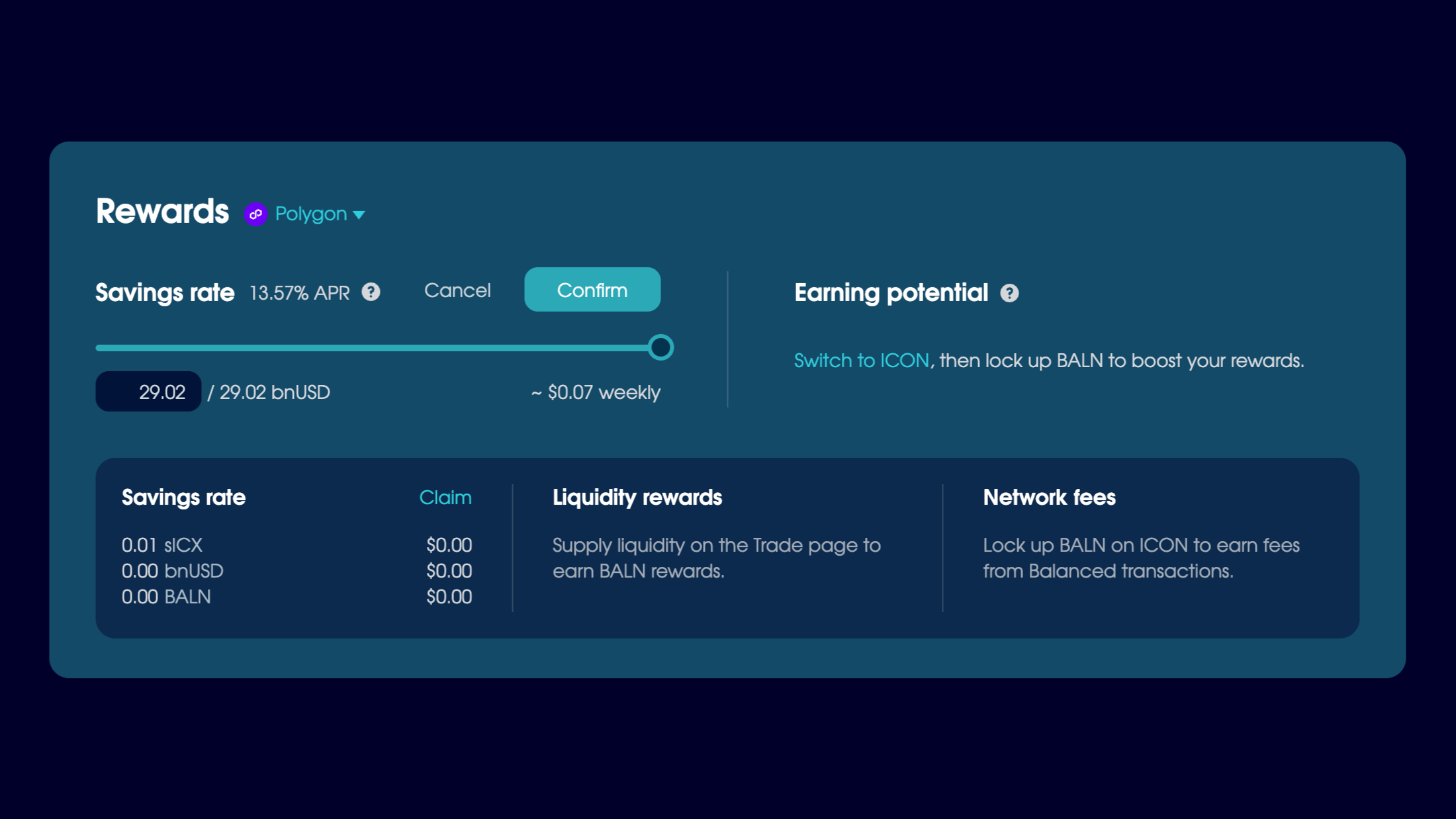 Balanced is now live on Polygon, its sixth connection within the EVM ecosystem. You can use Balanced on Polygon to swap and transfer crypto between 12 other blockchains, and earn a return for bnUSD through the Balanced Savings Rate.