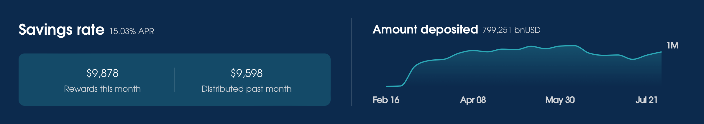 The Savings Rate has grown steadily over the past few months. It now offers an average return of 15% per year, thanks to incentives generated through borrower interest and ICON blockchain emissions. This translates to over $9,000 in rewards each month, with 75,280 sICX and 24,190 bnUSD paid out to date.