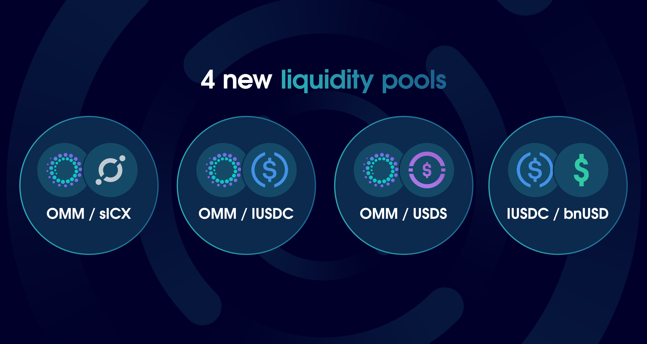 - Listed 4 new liquidity pools: IUSDC/bnUSD, OMM/sICX, OMM/IUSDC, and OMM/USDS