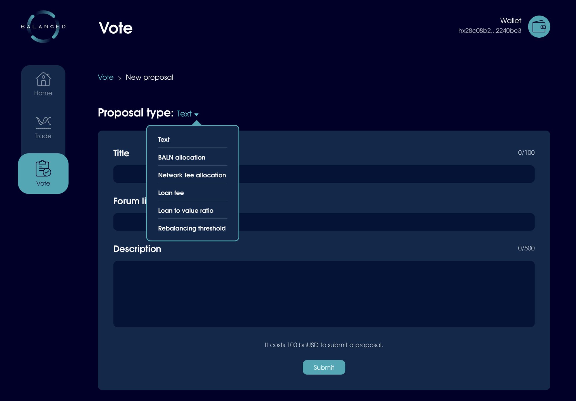 To submit a proposal, you'll need to have staked at least 0.1% of the total BALN supply, and pay a 100 bnUSD fee.