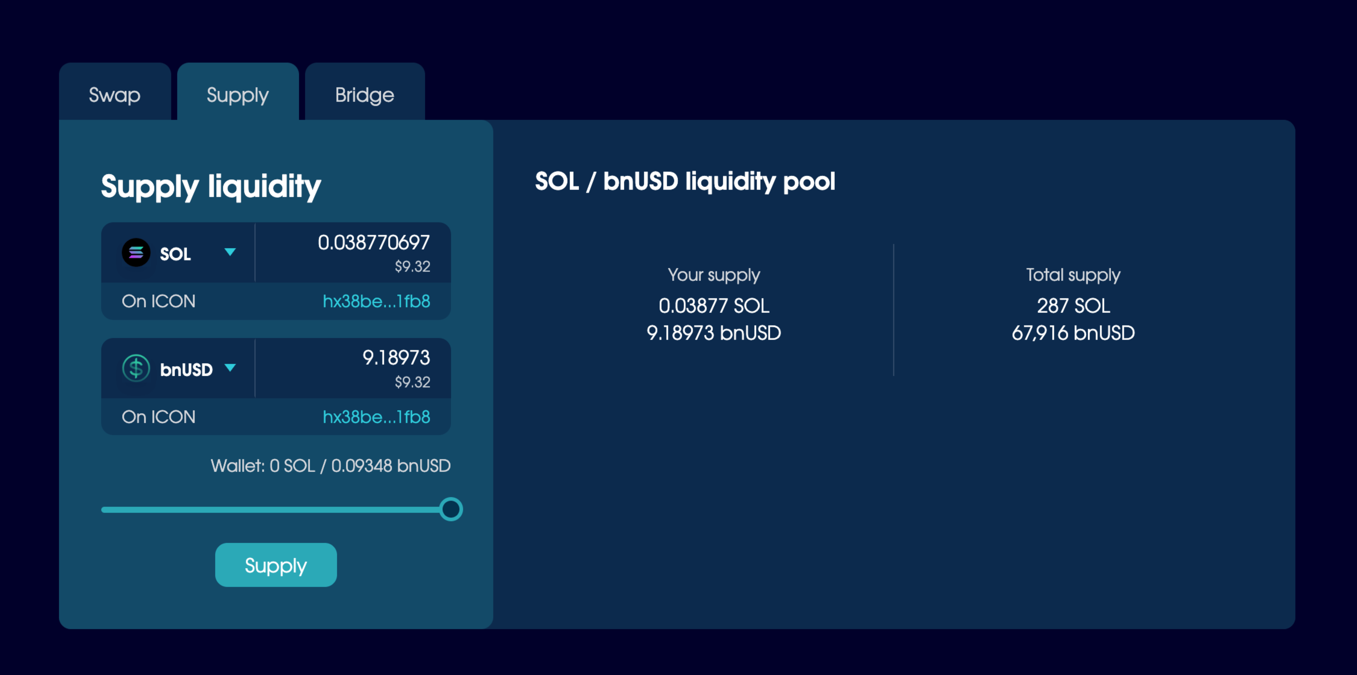 If you connect an ICON wallet and add SOL and bnUSD to it, you can also supply liquidity to improve the trading experience. Liquidity pools earn 50% of the fee from each trade, and once cross-chain pools launch in January 2025, you can provide liquidity directly from Solana.