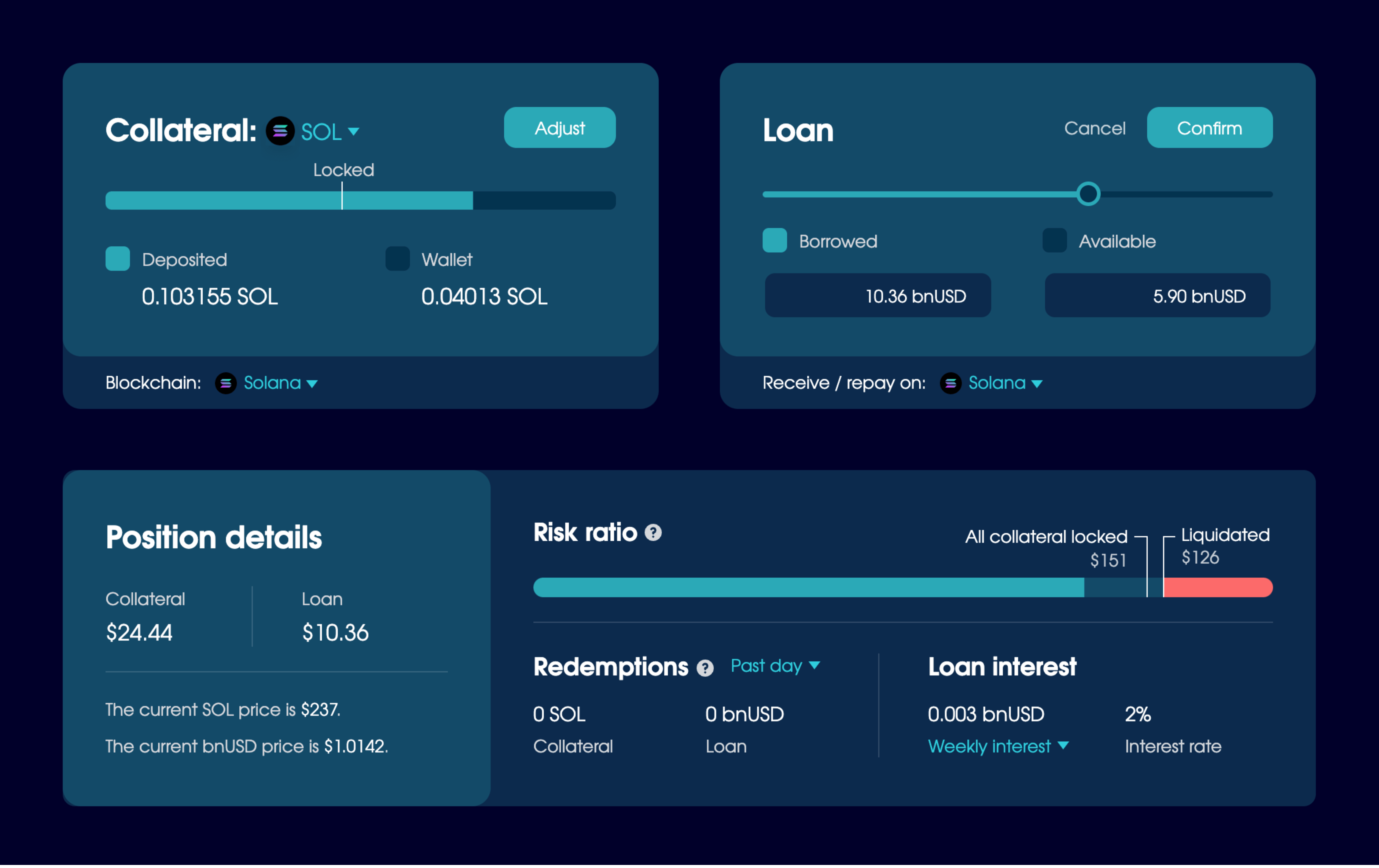 SOL and JitoSOL are available to use as collateral to borrow bnUSD. You can borrow up to 67% of the value for a 0.2% fee, and your debt will increase by 2% per year.